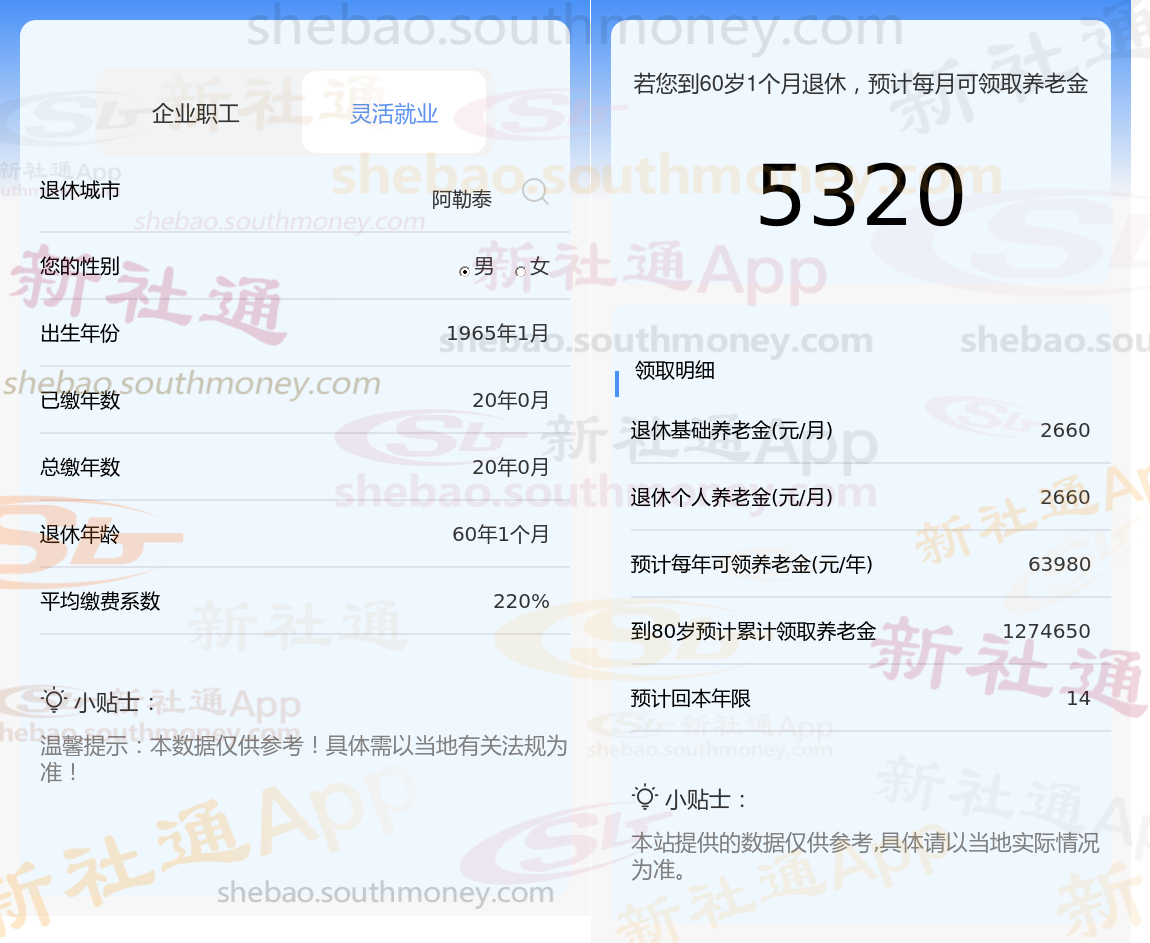 退休城市:阿勒泰,性别:男,出生年份:1965,总缴年数20年,缴费档次:220%,新社通app养老金计算器所得: