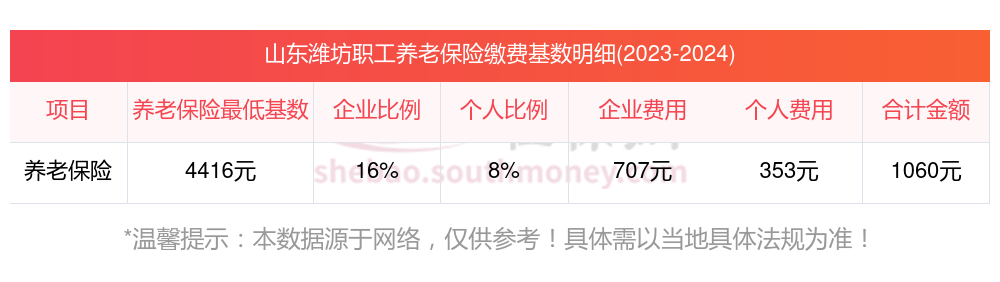 山东潍坊养老保险缴费基数2023-2024年最新标准(最低)