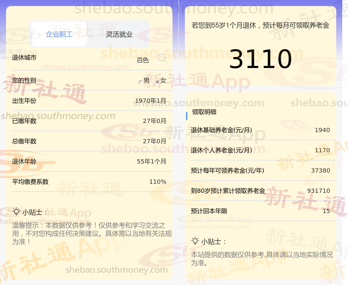 谢某,作为一位勤勉的职工,他的养老保险缴纳记录长达27年之久,且缴费档次一直保持在较高的110%水平。基于这些关键数据,我们利用新社通app养老金计算器,结合最新的养老保险法规,对其养老金进行了如下估算: