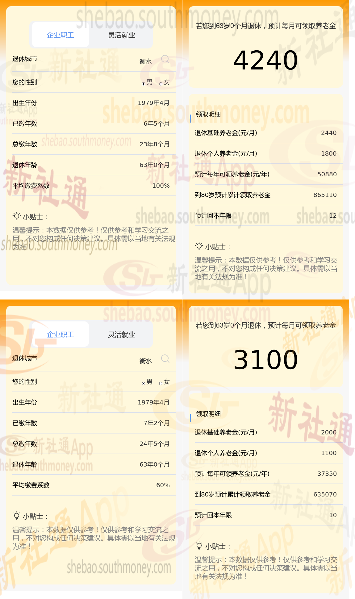 根据新社通app养老金计算器,轻松测算您的养老金!计算所得出:孔某与老严的差别,缴费年限、缴费档位不同的情况下,差别4240-3100=1140元。