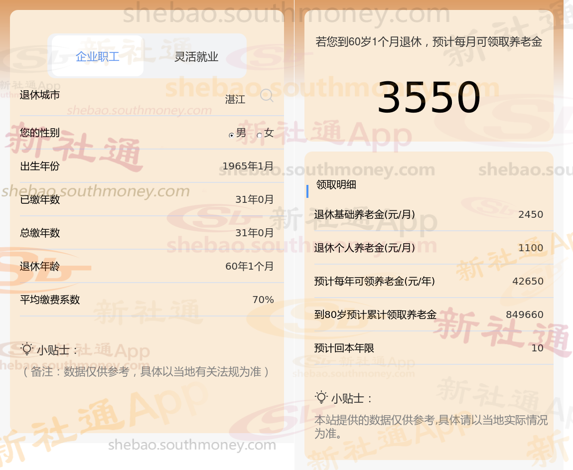 林某,男,1965年出生,现居湛江并已退休。其养老保险缴纳情况如下:总缴费年限为31年,缴费档次达到70%。根据新社通app养老金计算器的估算结果: