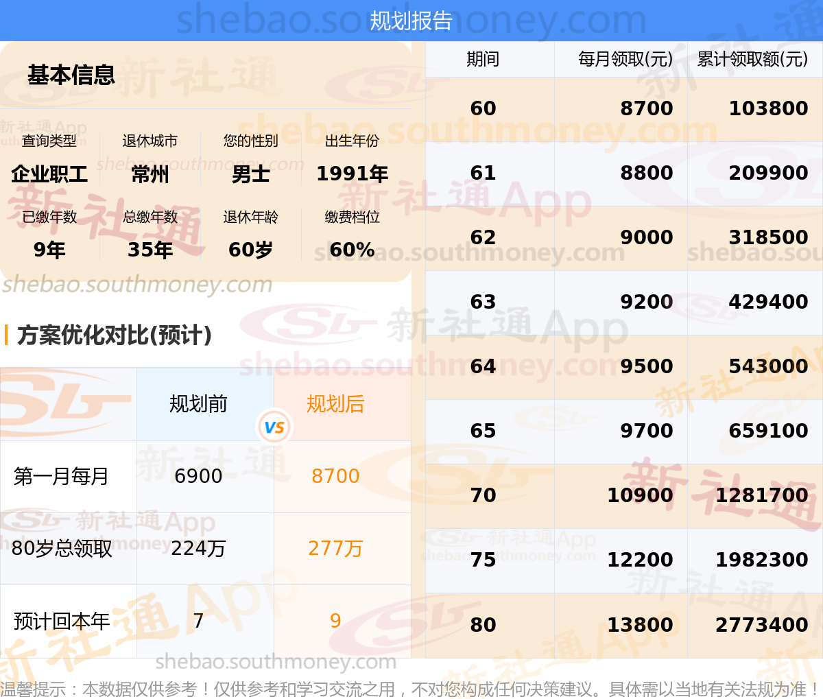 规划前:60岁第一个月约领6900元,新社通APP-养老金规划后:60岁第一个月约领8700元