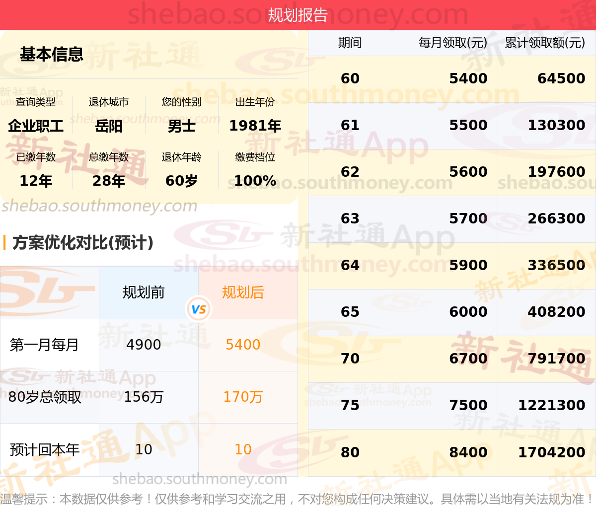 规划前:60岁第一个月约领4900元,新社通APP-养老金规划后:60岁第一个月约领5400元