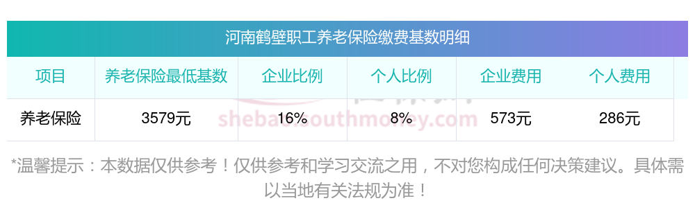 河南鹤壁假设某职工养老保险的缴费基数为3579元,单位缴费比例为16%,个人缴费比例为8%。