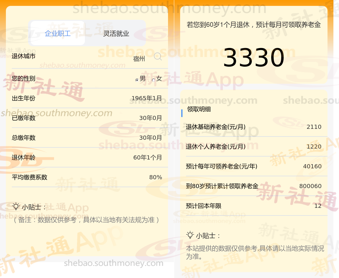 退休城市:宿州,性别:男,出生年份:1965,总缴年数30年,缴费档次:80%,新社通app养老金计算器所得:
