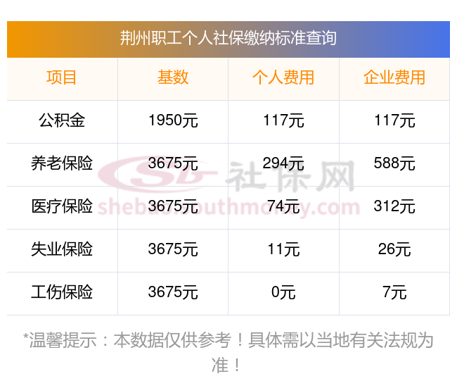 2025年荆州社保缴费多少钱?下表是2024-2025年荆州社保费用明细参考,新社通app-社保缴费查询工具提供的最新数据如下: