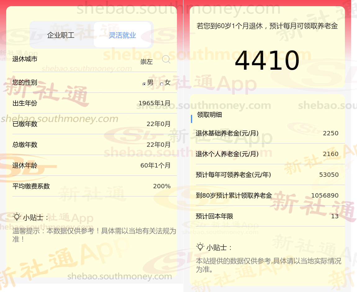 柯某,作为一位勤勉的职工,他的养老保险缴纳记录长达22年之久,且缴费档次一直保持在较高的200%水平。基于这些关键数据,我们利用新社通app养老金计算器,结合最新的养老保险法规,对其养老金进行了如下估算: