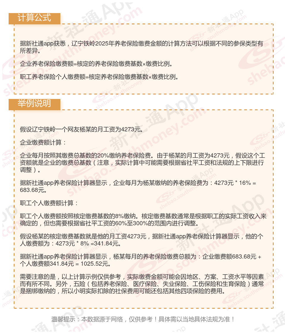 据新社通app获悉,养老保险是与参保人退休后的待遇相关的,只有达到了一定的缴费水平,退休后才能享受较好的待遇水平,也就是说缴费水平过低的话,那么未来能够享受的养老金水平也会比较低。而养老保险保费需要根据缴费基数确定。下面随新社通app小编一起来看看,辽宁铁岭养老保险缴费标准2024年是多少?附养老金计算公式(在线计算器)。