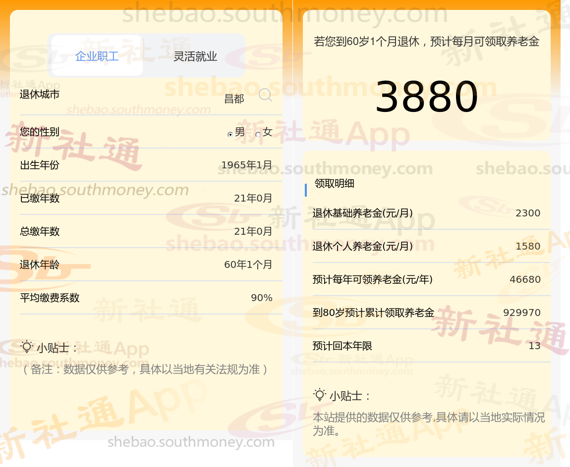 柯某,拥有长达21年的养老保险缴纳年限,其缴费档次一直维持在较高的90%水平。基于这些详细信息,我们使用了新社通app养老金计算器,并参考了当前的养老保险法规,对他未来的养老金进行了如下估算: