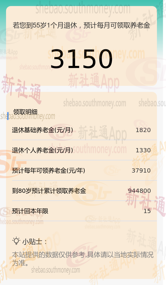 每月可领养老金总额:将基础养老金与个人养老金相加,每月可领取的养老金总额约为3150元(1820元+1330元)。