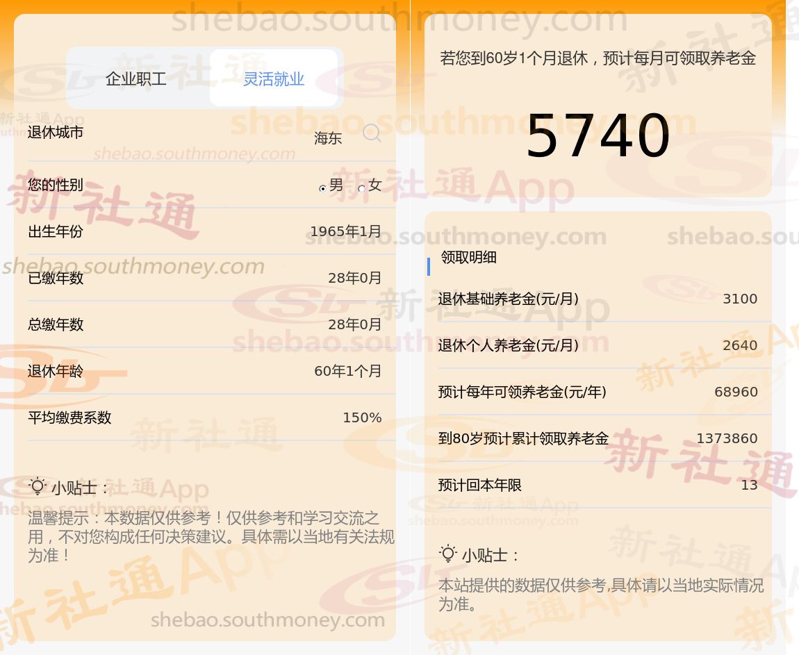 退休城市:海东,性别:男,出生年份:1965,总缴年数28年,缴费档次:150%,新社通app养老金计算器所得: