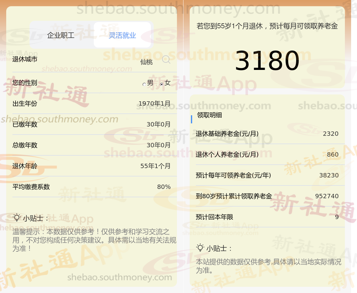 退休城市:仙桃,性别:女,出生年份:1970,总缴年数30年,缴费档次:80%,新社通app养老金计算器所得: