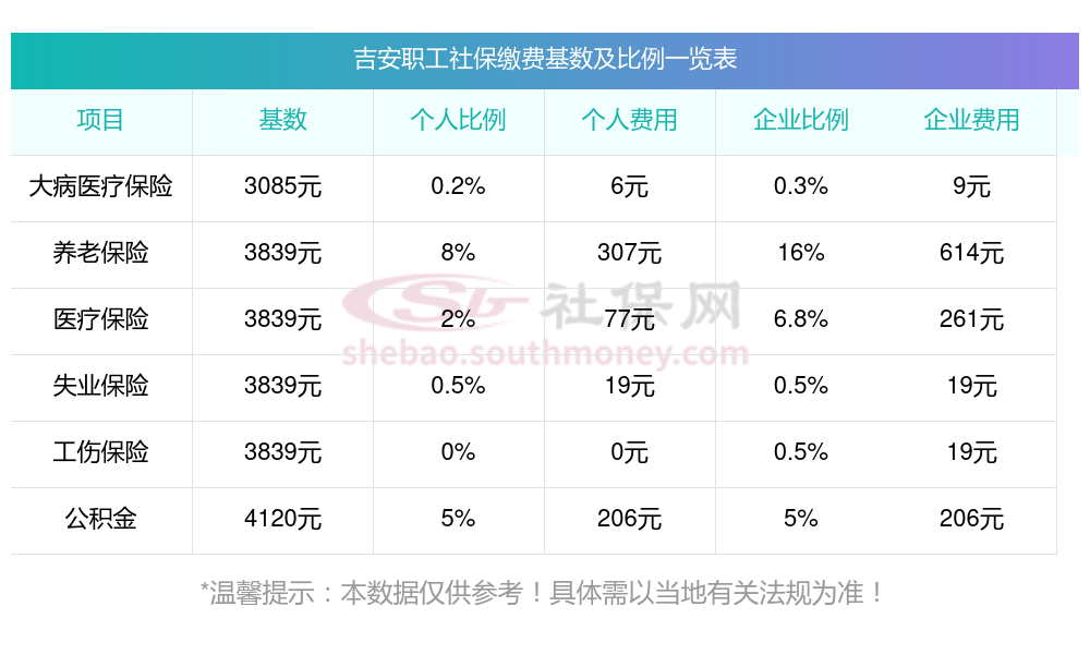 吉安缴费社保比例一览 社保公司和个人各交多少?下表是2024-2025年吉安社保费用明细参考,新社通app-社保缴费查询工具提供的最新数据如下: