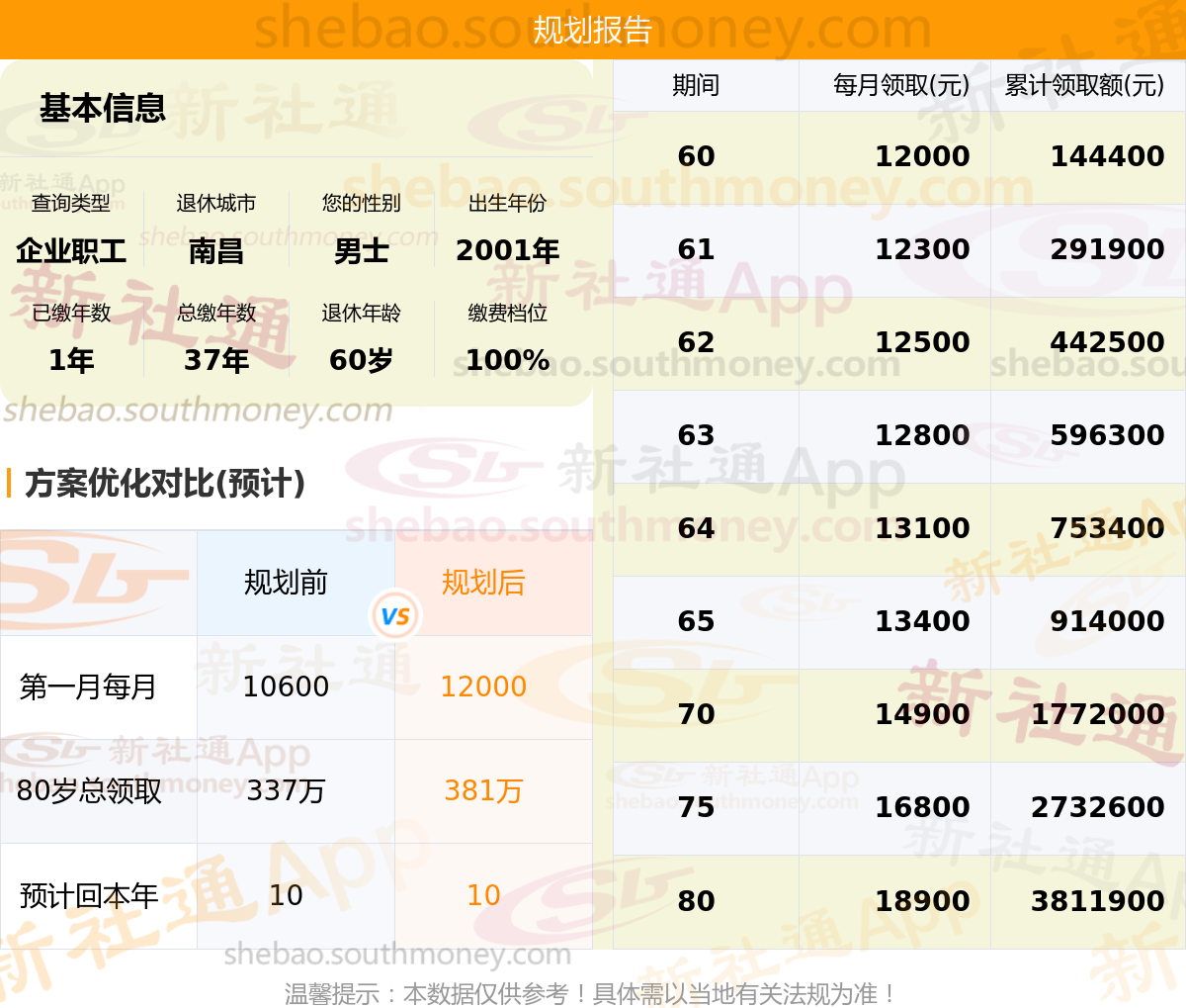 规划前:60岁养老金约10600元,新社通APP-养老金规划后:60岁养老金约12000元