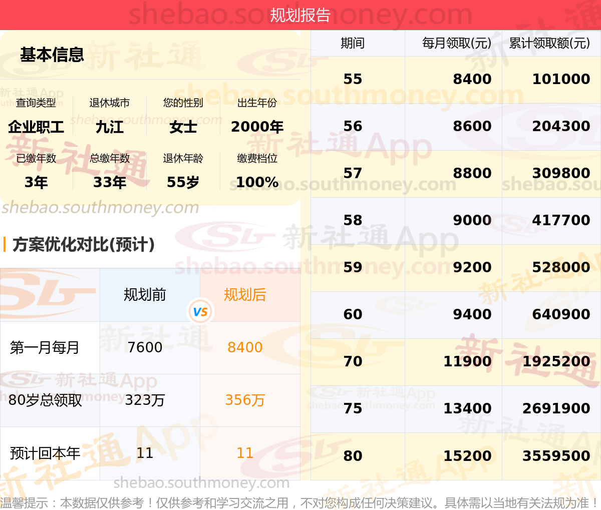 规划前:55岁第一个月约领7600元,新社通APP-养老金规划后:55岁第一个月约领8400元