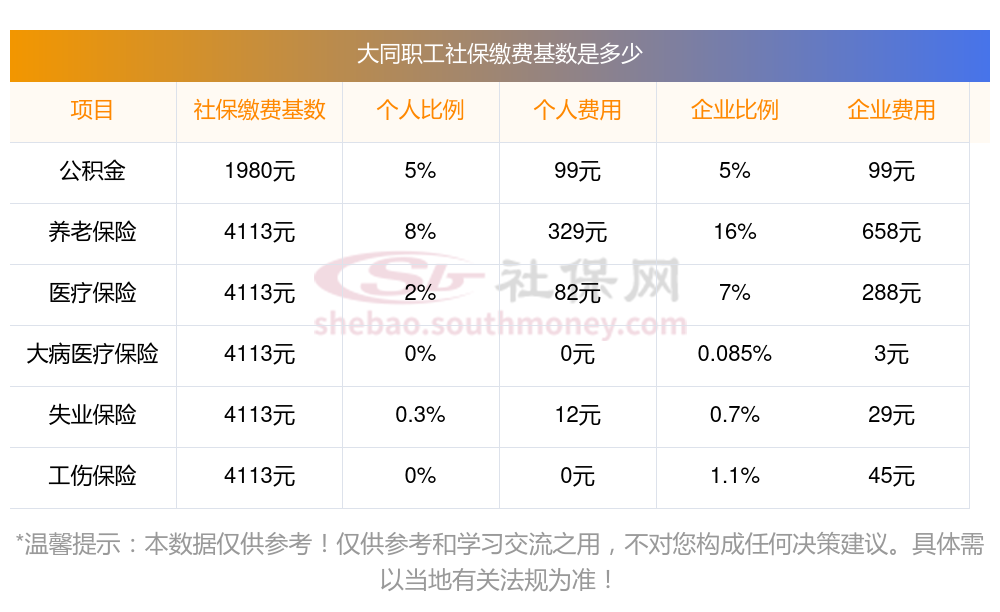 2025年大同社保缴费多少钱?下表是2024-2025年大同社保费用明细参考,新社通app-社保缴费查询工具提供的最新数据如下: