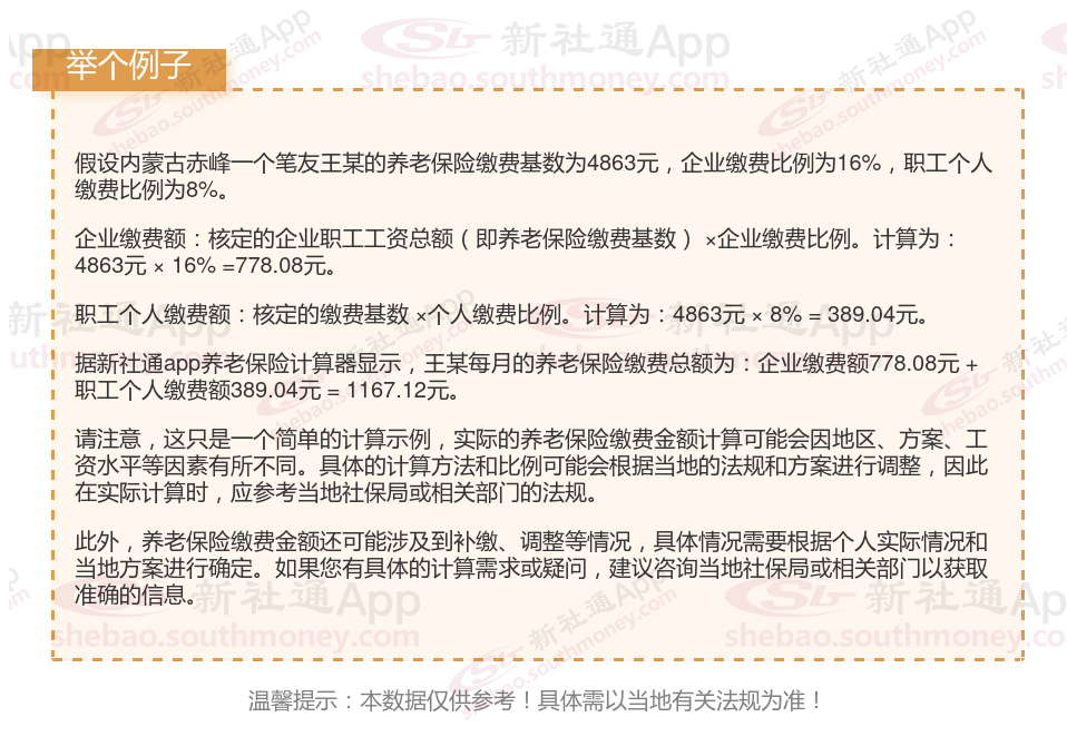 据新社通app显示,内蒙古赤峰职工养老保险最低缴费基数为:4863元;单位和个人的缴费比例分别为:16%、8%;