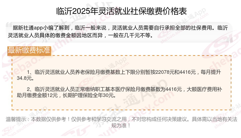 据新社通app数据显示,临沂灵活就业养老保险的缴费基数为:4416元。灵活就业人员参保缴费的比例为个人20%。
