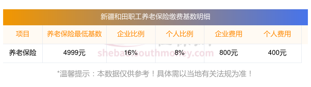 假设新疆和田某职工的养老保险缴费基数为4999元,企业缴费比例为16%,职工个人缴费比例为8%。