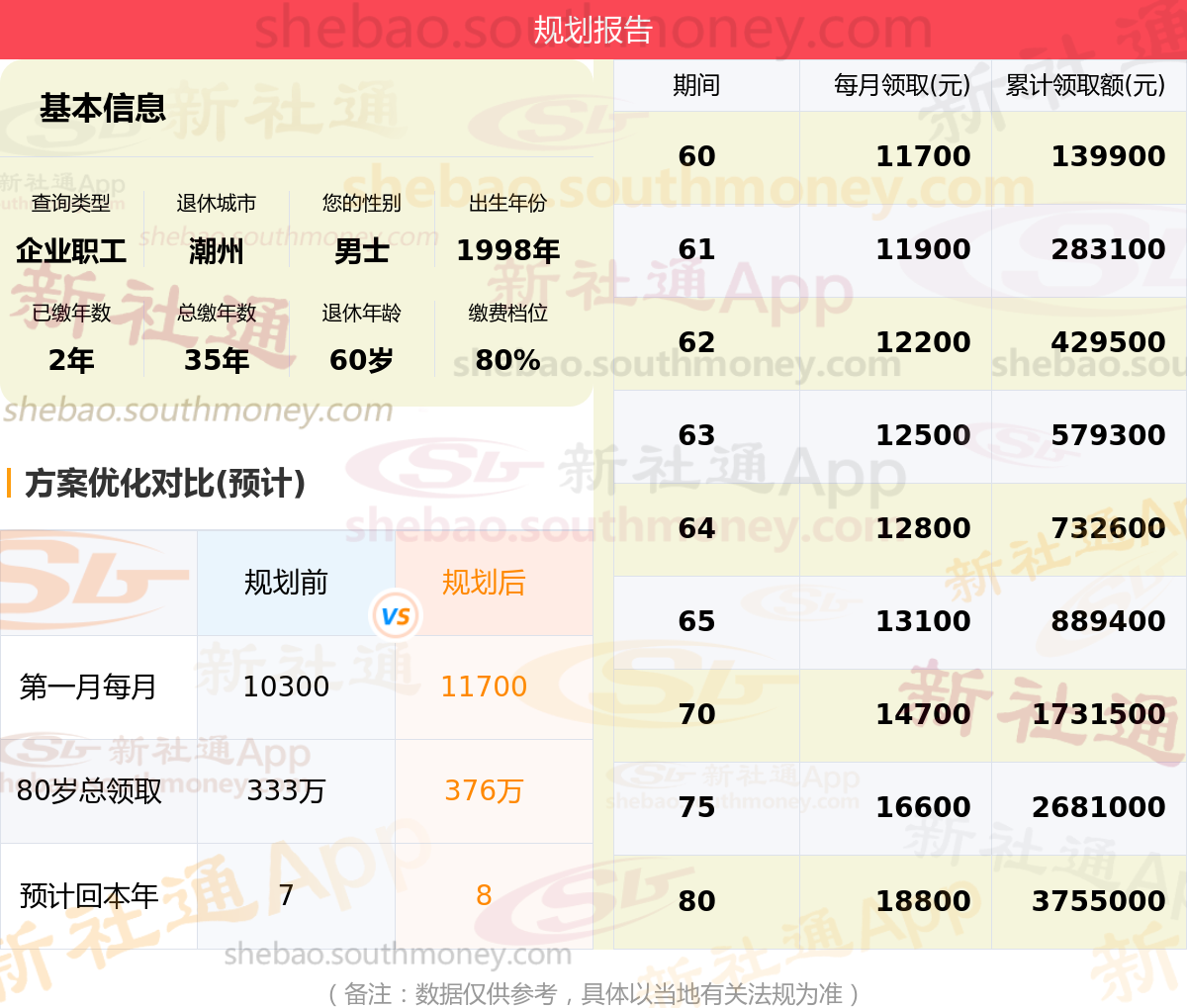 规划前:参保城市:广东潮州,性别:男士,出生年月:1998,已缴年限:2年,总缴年数:35年,退休年龄:60岁,缴费档位:80%。
