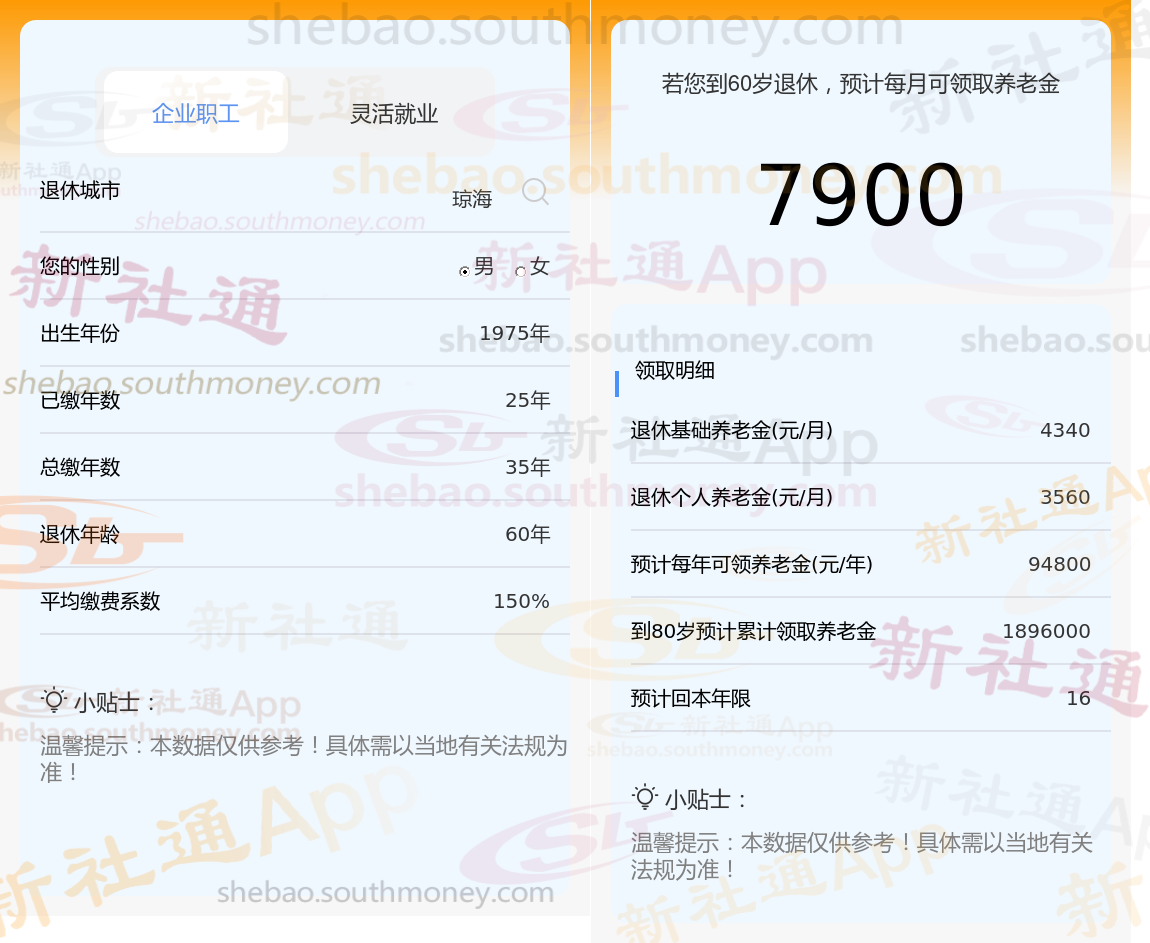 通过新社通APP-养老金计算所得:退休城市、出生年份、退休年龄、缴费系数都相同的情况下,社保缴费年限累计35年时,计算如下: