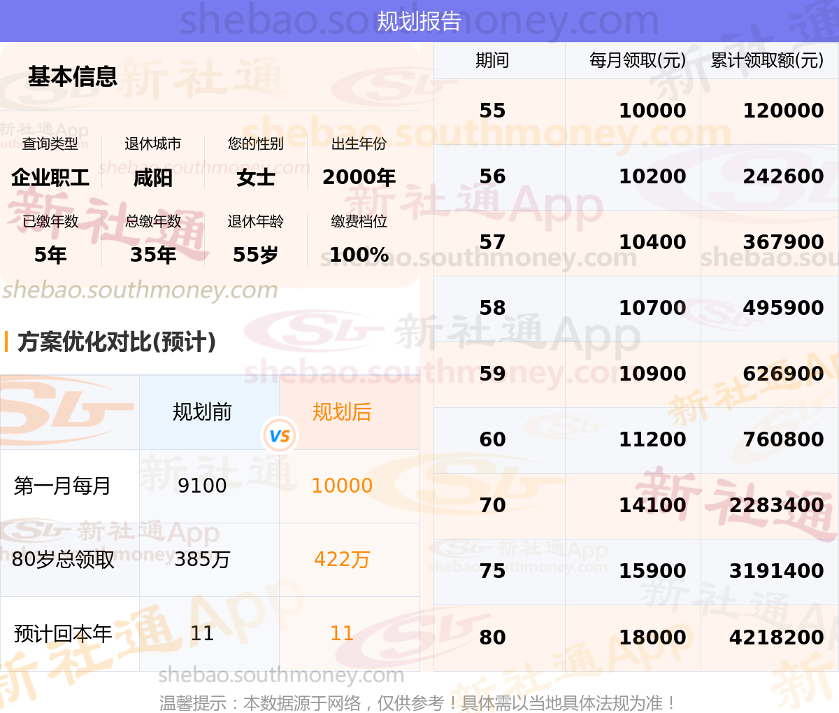 规划前:55岁每月约领9100元,新社通APP-养老金规划后:55岁每月约领10000元