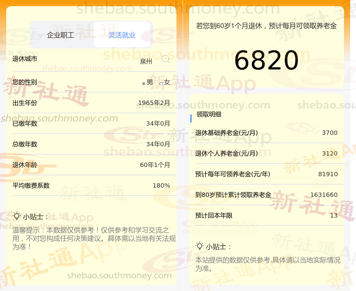 退休城市:泉州,性别:男,出生年份:1965,总缴年数34年,缴费档次:180%,新社通app养老金计算器所得: