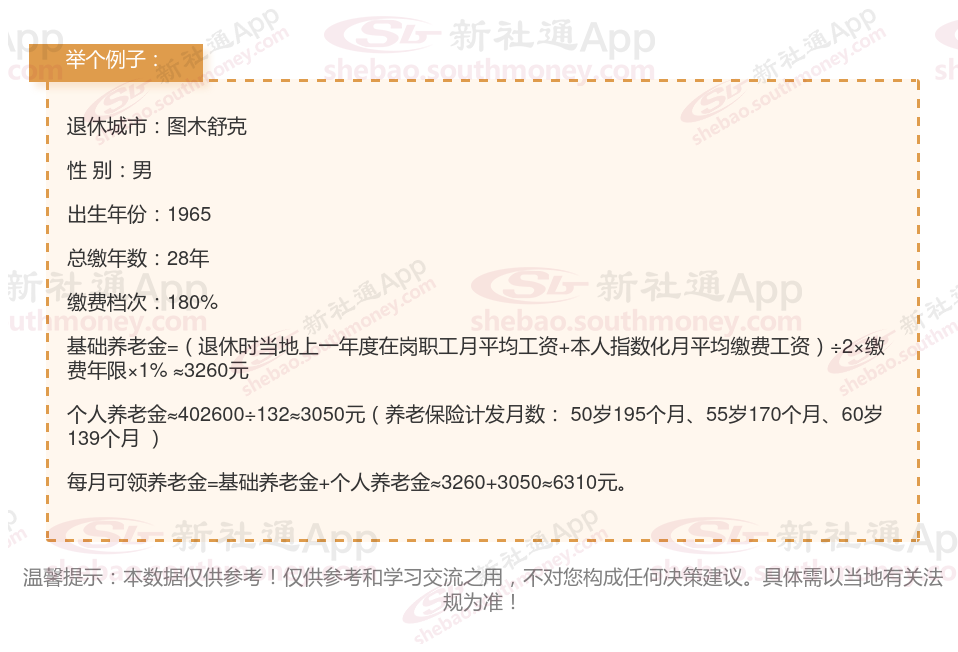 这是一位1965年出生的男性退休职工的个人档案,他来自图木舒克,已缴纳社保28年,且缴费档次为180%。通过新社通app养老金计算器得出: