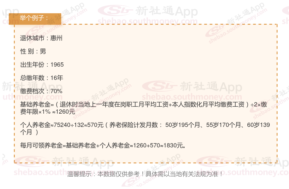 这是一位1965年出生的男性退休职工的个人档案,他来自惠州,已缴纳社保16年,且缴费档次为70%。通过新社通app养老金计算器得出: