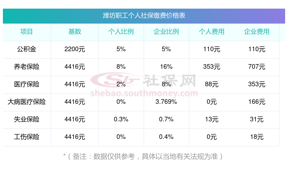 山东潍坊缴费社保比例一览 社保公司和个人各交多少?下表是2024-2025年山东潍坊社保费用明细参考,新社通app-社保缴费查询工具提供的最新数据如下: