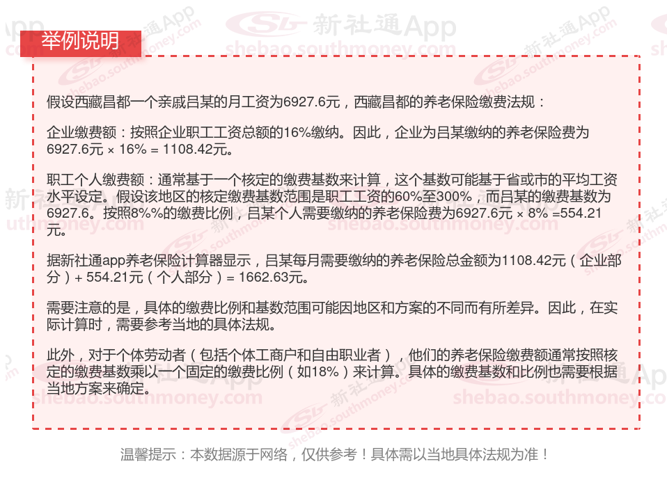 据新社通app显示,西藏昌都企业职工养老保险的缴费基数为:6927.6元。