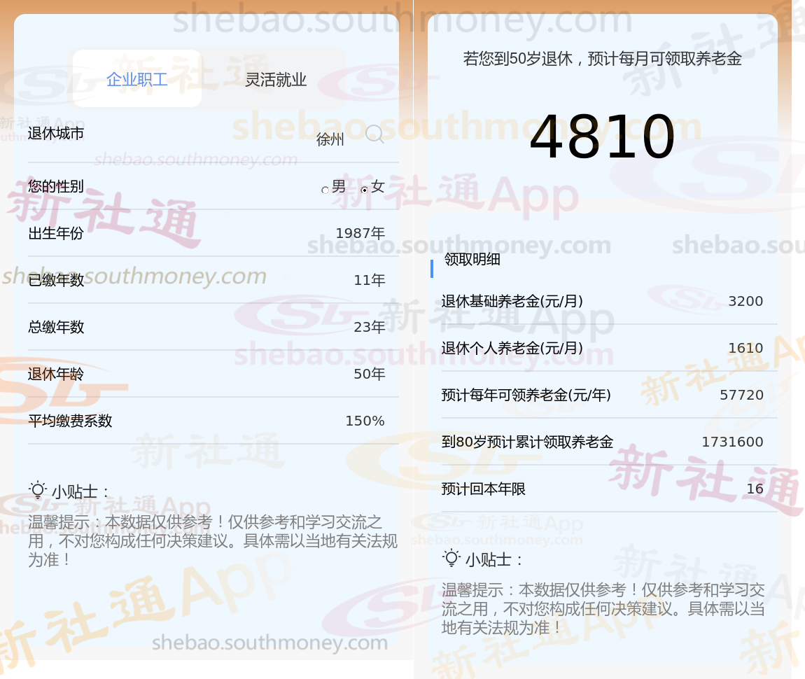 通过新社通APP-养老金计算所得:退休城市、出生年份、退休年龄、缴费系数都相同的情况下,社保缴费年限累计23年时,计算如下: