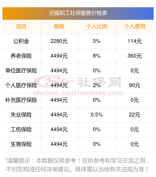 2025年无锡社保缴费多少钱?下表是2023-2024年无锡社保费用明细参考,如下: