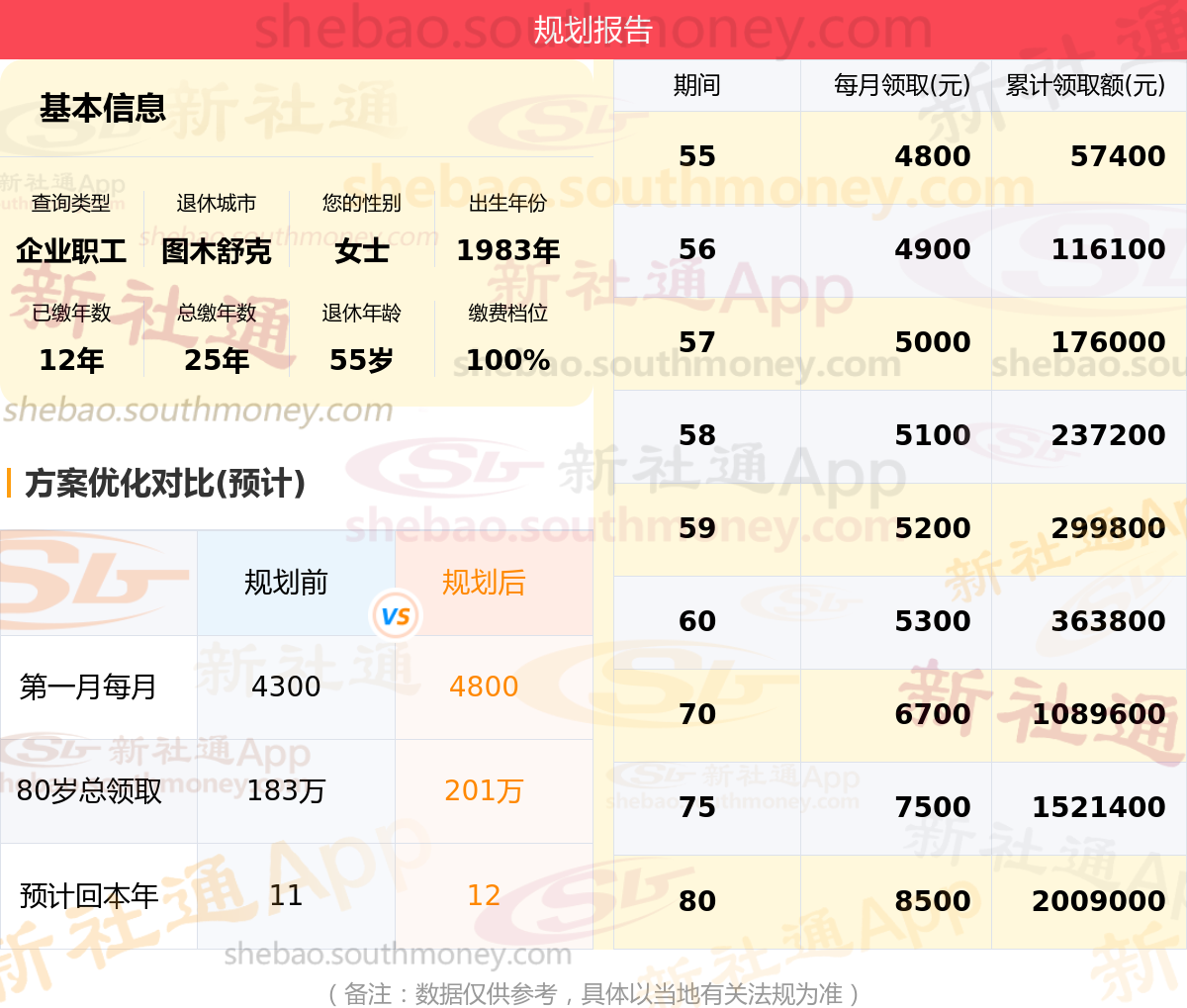 规划前:55岁第一个月约领4300元,新社通APP-养老金规划后:55岁第一个月约领4800元