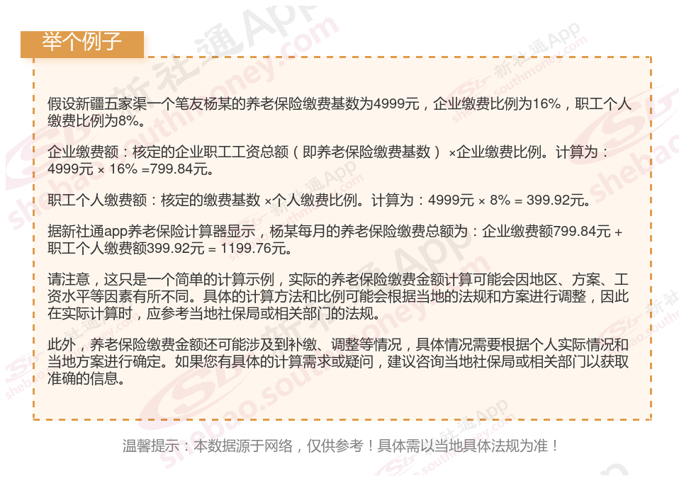 据新社通app显示,新疆五家渠2024-2025企业职工养老保险的缴费基数为:4999元。