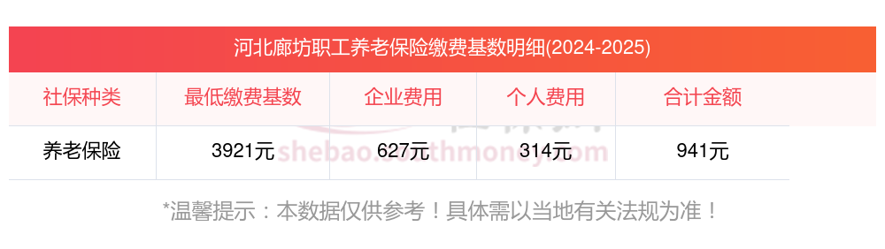 据新社通app获悉,职工在正式上班并转正后,最重视的就是自己的福利待遇。特别是公司代为缴纳的五险一金,很多职工都会去查询五险一金的相关缴纳情况。养老保险是给予的福利待遇,用人单位是必须按照标准给职工缴纳的。那么,河北廊坊养老金能领多少钱?职工养老保险缴费基数2024-2025年最新标准是多少。