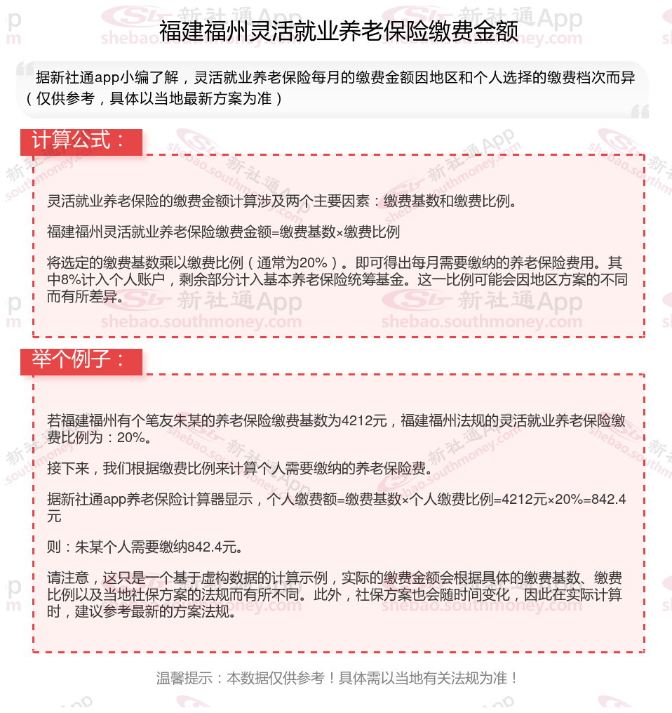 据新社通app显示,福建福州灵活就业养老保险缴费基数2024-2025年最新标准如下: