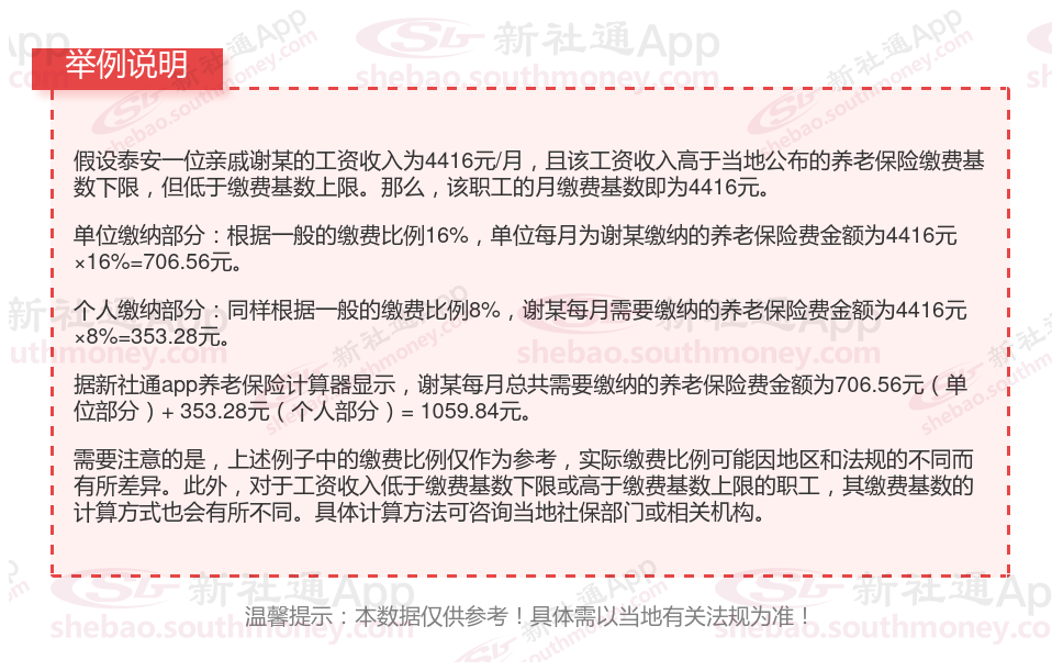 据新社通app获悉,泰安职工养老保险缴费金额的计算涉及到企业缴费额和职工个人缴费额两部分。以下是一个基于泰安的职工养老保险缴费金额计算示例: