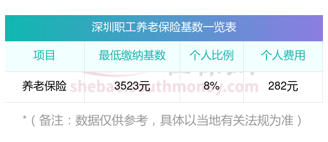 假设深圳某职工的工资总额为3523元,那么他的缴费基数就是3523元的60%到300%之间。如果他选择按照缴费基数为3523,据新社通app养老保险计算器测算显示,他的个人缴费额就是3523元*8%,等于281.84元。