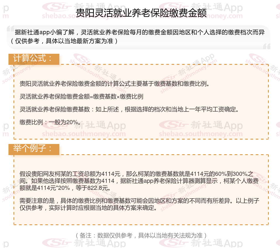 据新社通app显示,贵阳灵活就业养老保险缴费基数2024-2025年最新标准如下: