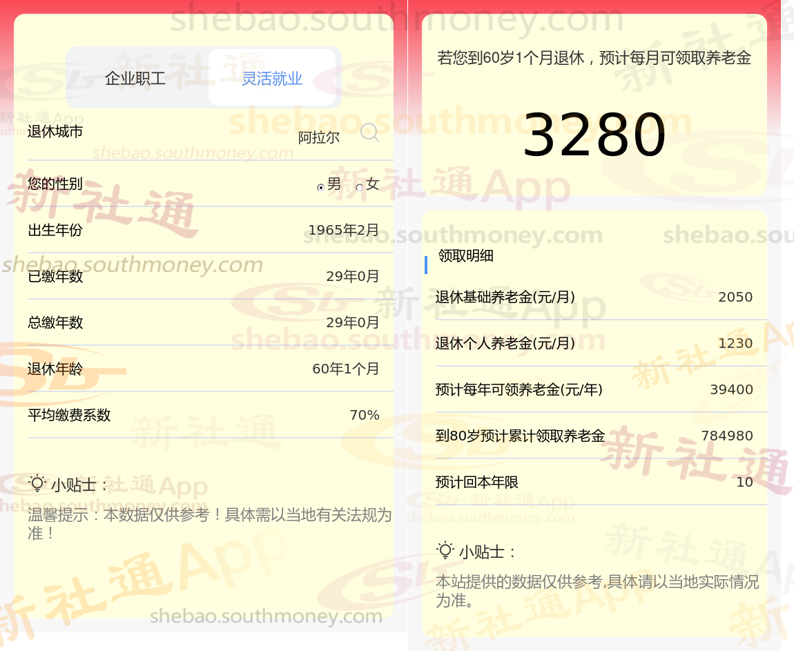 结果显示:他每月可以从个人账户中领取约1230元的养老金。将上述两部分相加,我们得出柯某每月预计可以领取的养老金总额为3280元。这一结果是由新社通app养老金计算器基于给定的参数和公式得出的估算值。