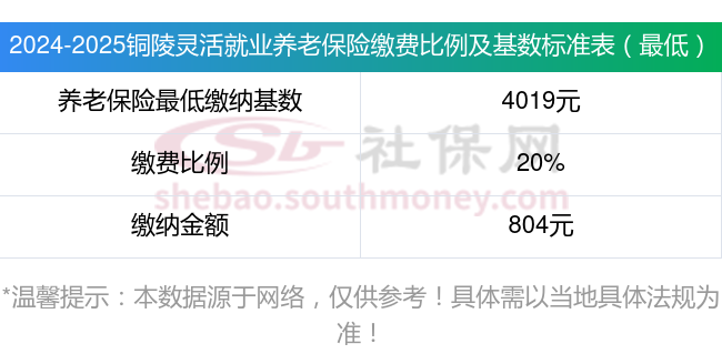 据新社通app显示,铜陵灵活就业养老保险最低缴费基数为:4019元;个人的缴费比例分别为:20%;