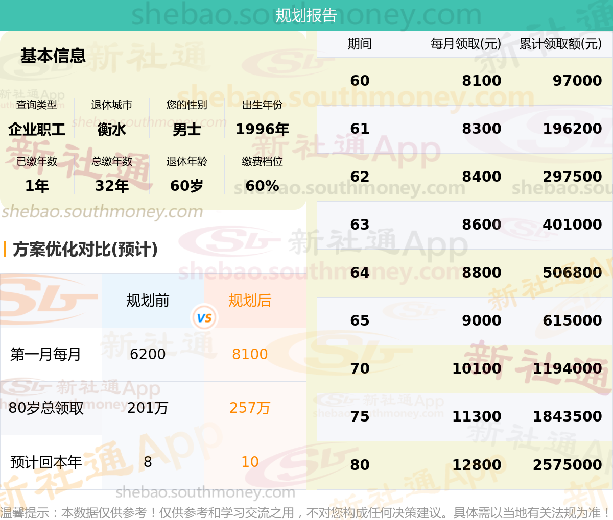 规划后:60岁退休金 = 基础养老金 + 个人账户养老金根据新社APP计算出每月养老金为8100元。
