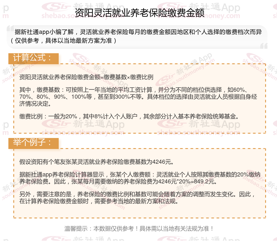 据新社通app显示,2024-2025年资阳灵活就业养老保险的缴费标准: