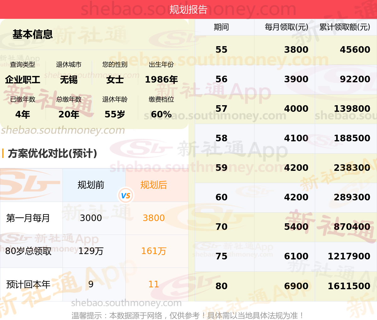 规划前:55岁第一个月约领3000元,新社通APP-养老金规划后:55岁第一个月约领3800元