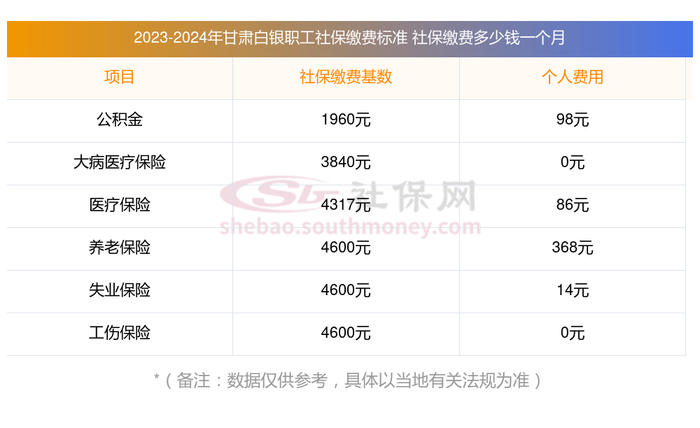 2025年甘肃白银社保缴费多少钱?下表是2024-2025年甘肃白银社保费用明细参考,新社通app-社保缴费查询工具提供的最新数据如下: