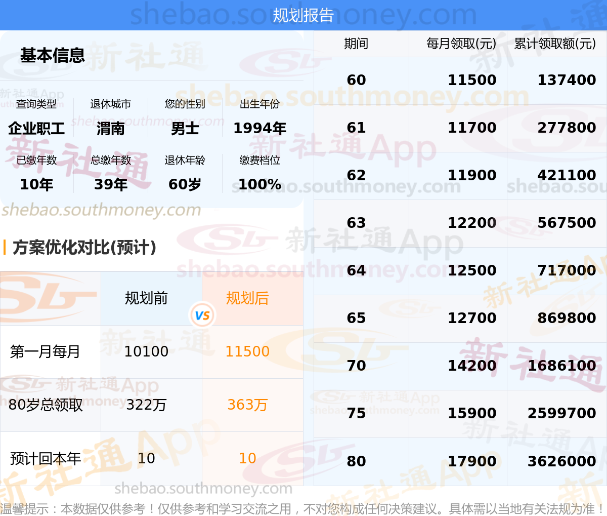 规划前:60岁第一个月约领10100元,新社通APP-养老金规划后:60岁第一个月约领11500元