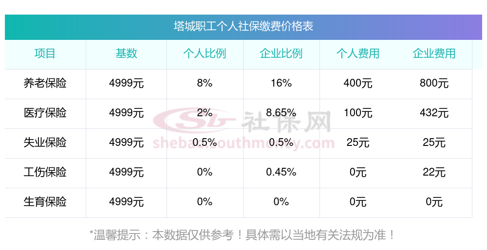 塔城社保一个月交多少钱,个人缴纳多少钱一个月?下面和新社小编一起来看看塔城最低标准社保费用明细参考,新社通app-社保缴费查询工具提供的最新数据如下: