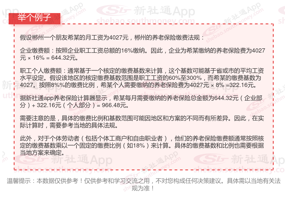 据新社通app获悉,郴州养老保险缴费金额的计算主要依据缴费基数和缴费比例。以下是一个具体的计算举例: