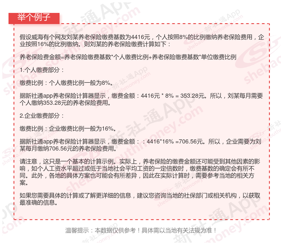 据新社通app显示,威海职工养老保险最低缴费基数为:4416元;单位和个人的缴费比例分别为:16%、8%;